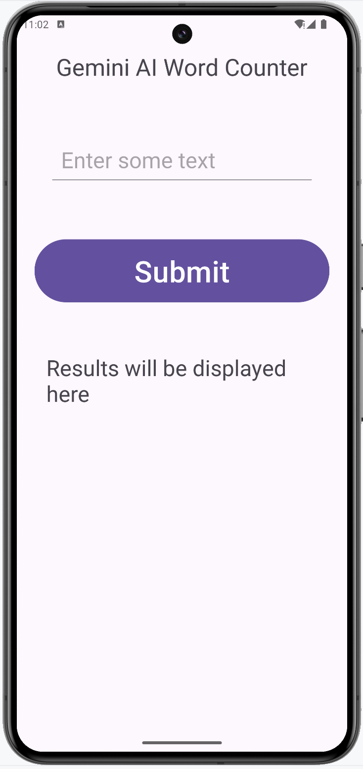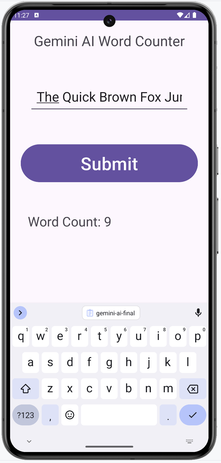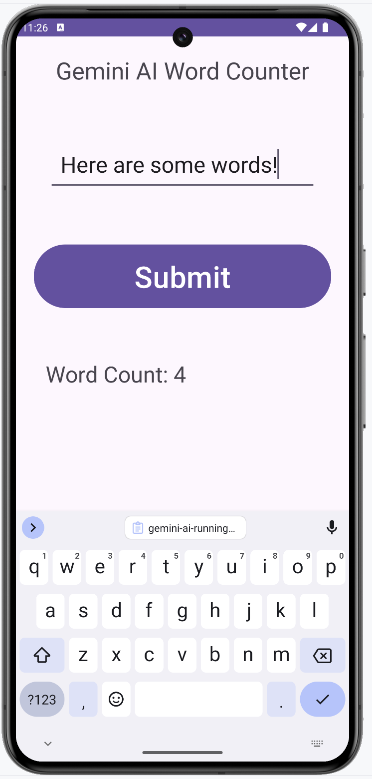Welcome to the lab on leveraging Gemini AI in Android Studio. In this lab, you will create a simple app with a linear layout and basic widgets, guided by Gemini AI. The app will take user input and output the number of words in that input. The goal is for you not to write any code, but ask Gemini to generate the logic for you. The final result would look something like this.