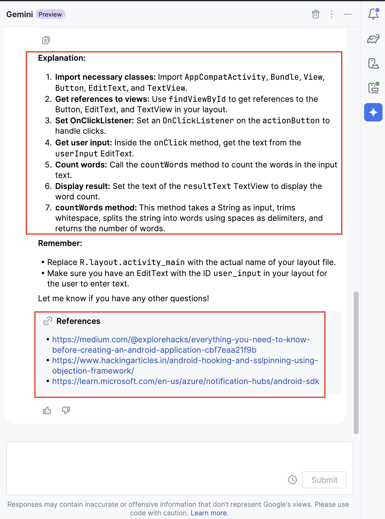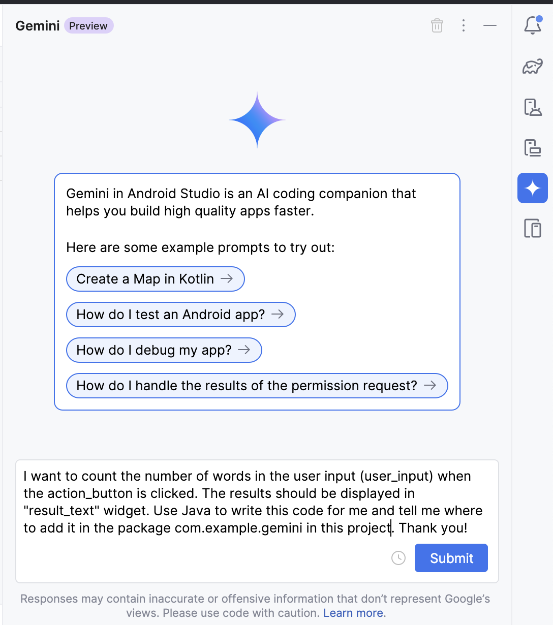 You have now successfully created an app with a linear layout, basic widgets, and hooked up the button click, leveraging Gemini AI to generate the application code. This foundational skill will be crucial as you continue to develop more complex AI-powered apps in Android Studio.