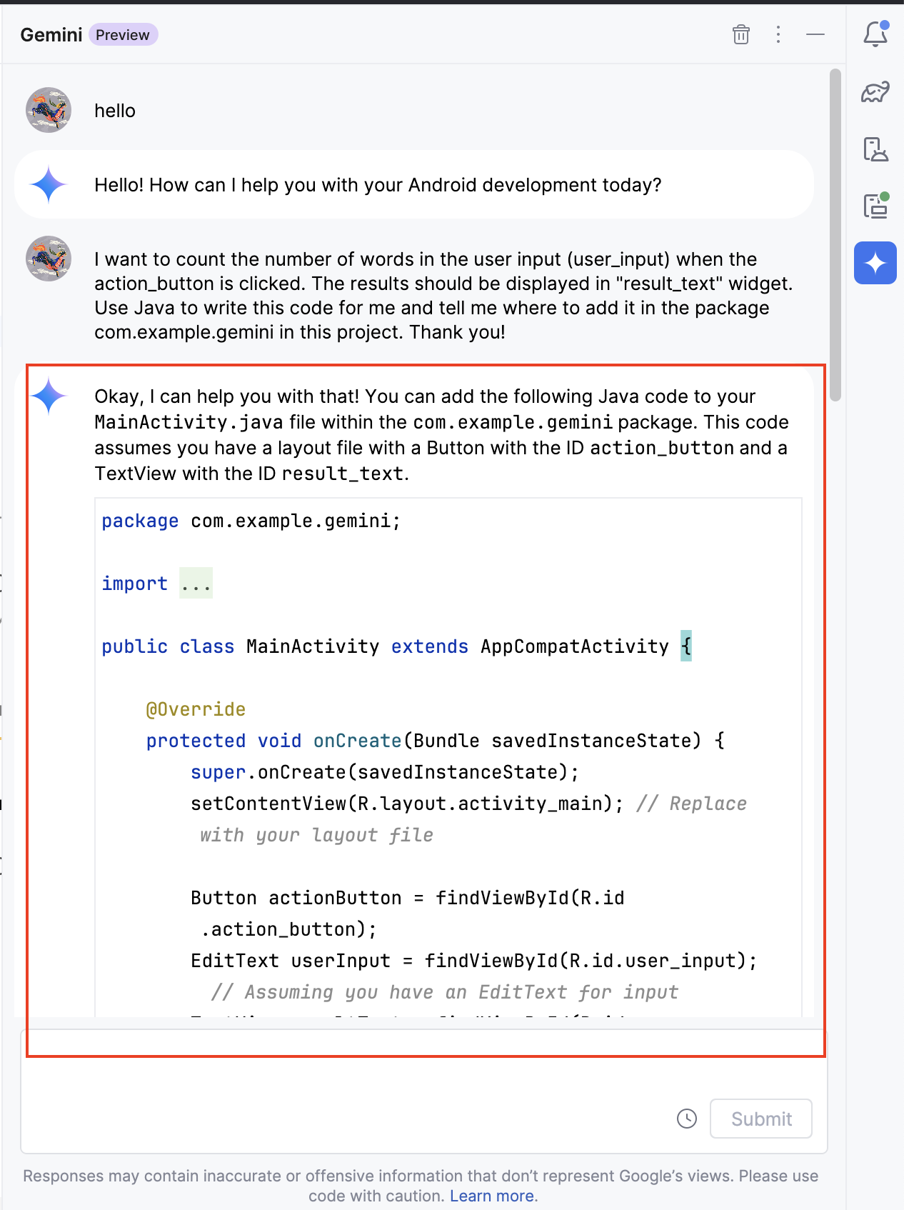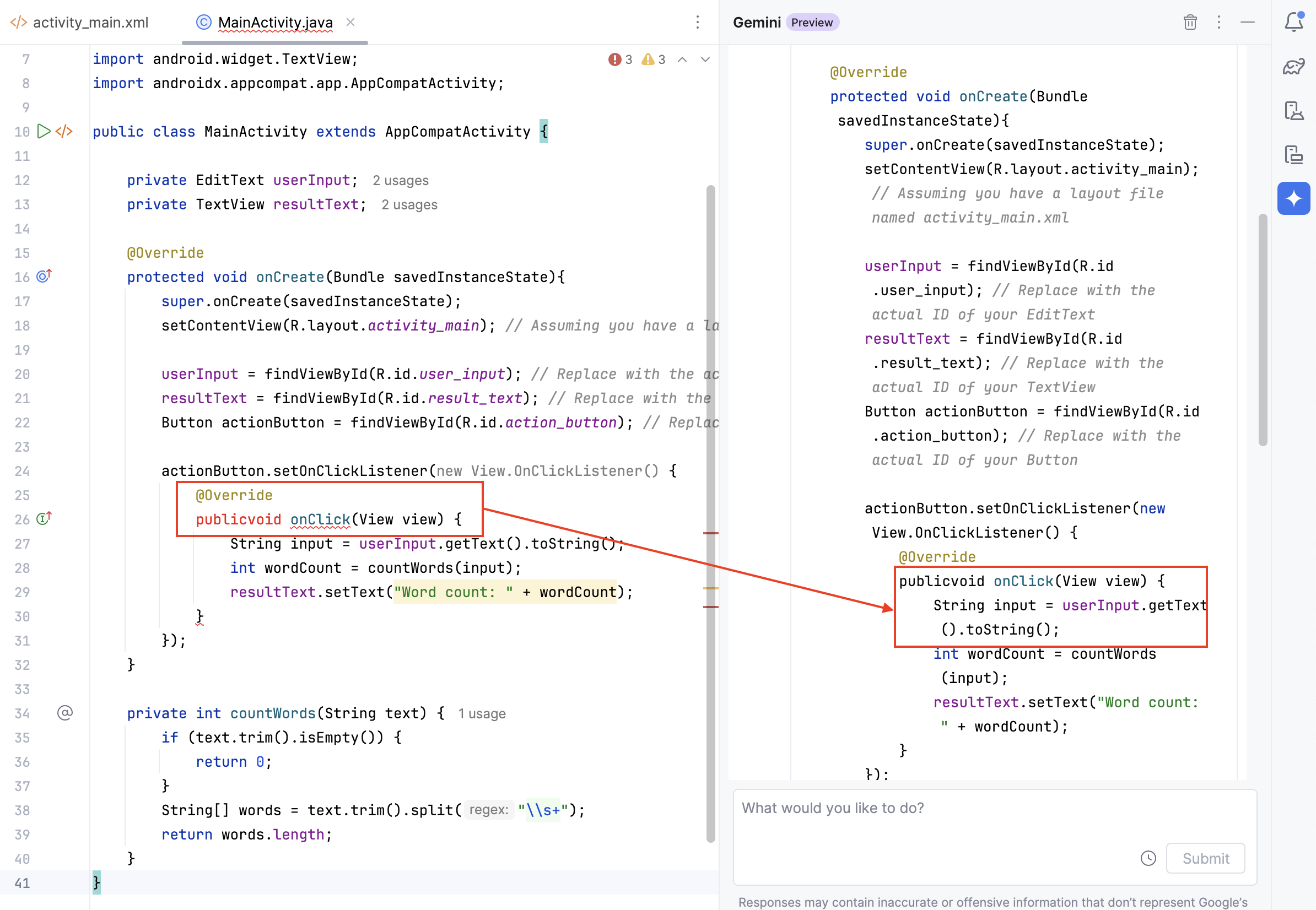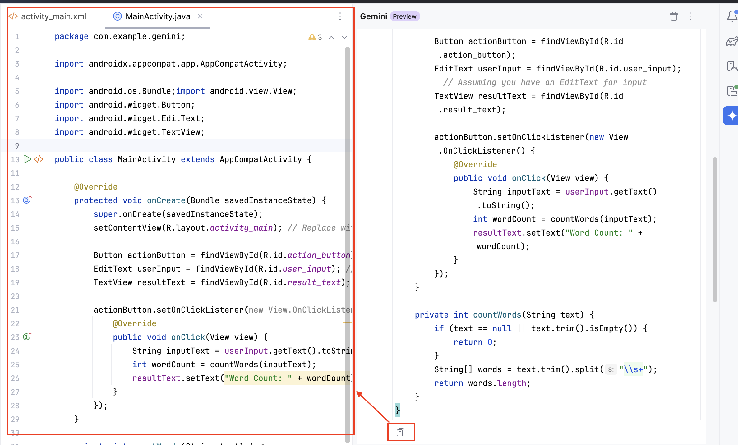 I want to count the number of words in the user input (user_input) when the action_button is clicked. The results should be displayed in "result_text" widget. Use Java to write this code for me and tell me where to add it in the package com.example.gemini in this project. Thank you!