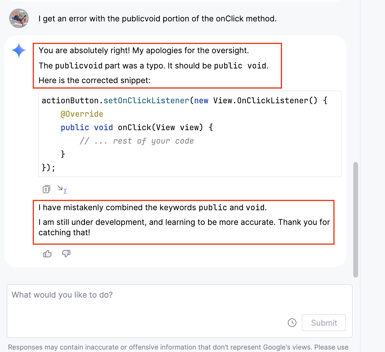 After letting Gemini know that it had made a mistake, it quickly apologized and corrected the function!